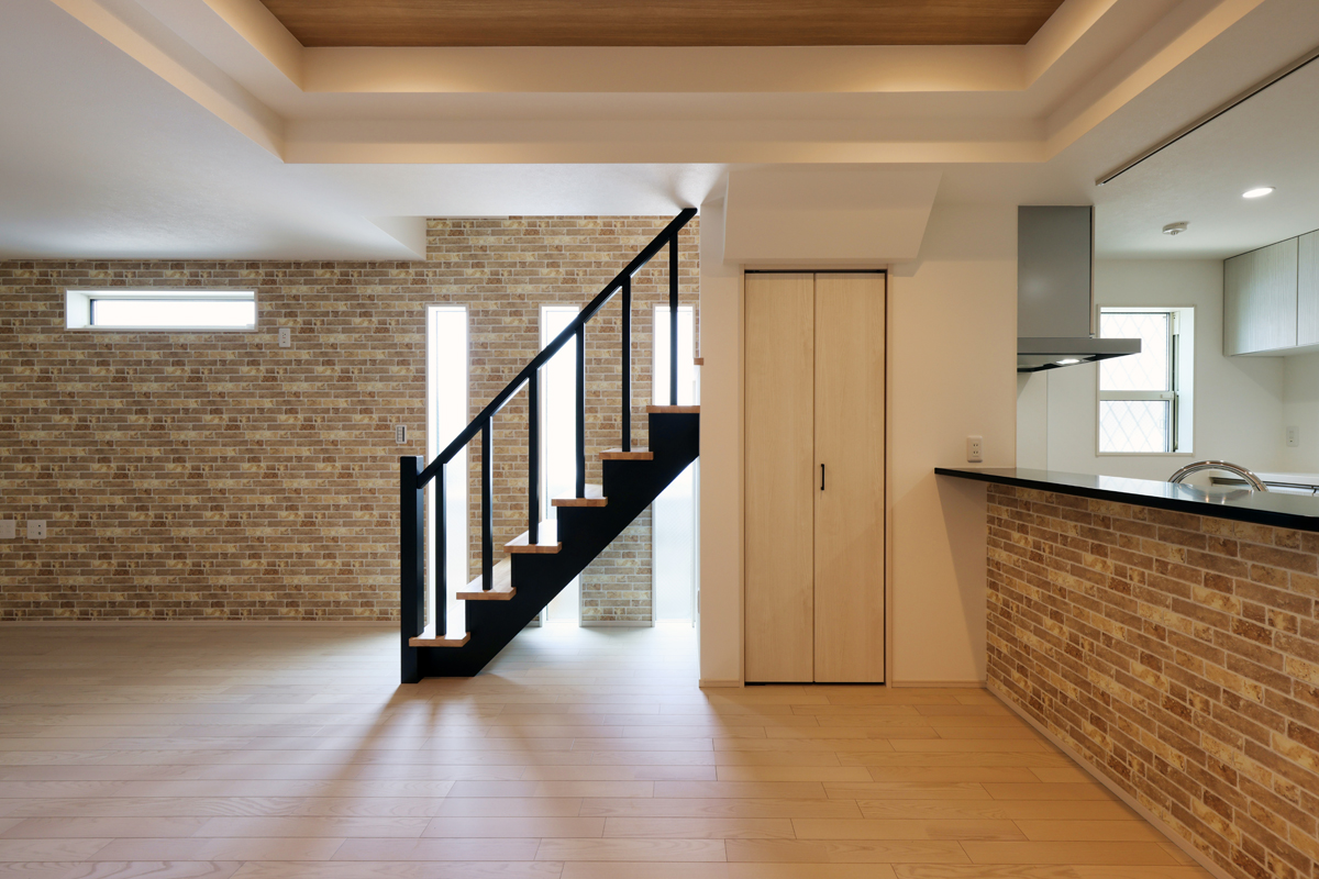 レンガ調の壁紙がとってもかわいいリビング。