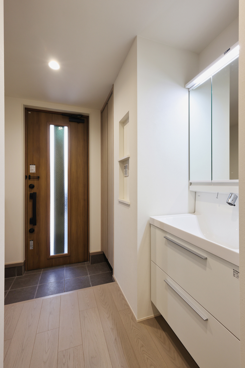玄関には洗面台を設け、帰宅後の手洗いから外出前の身支度までをスムーズに完結。